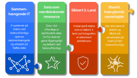 Data er en ressource, som gennem deling og genbrug anvendes til at skabe værdi for borgerne, virksomhederne og de offentlige forvaltninger til at skabe sammenhæng i det fælles offentlige.
