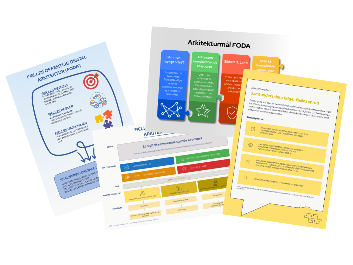 Her kan du finde informative illustrationer om FODA. Plakaterne kan anvendes til at opnå indblik og kendskab til FODA. Plakaterne kan printes og hænges op for at skabe opmærksomhed samt udbrede FODAs budskad og den fælles strategi for digital arkitektur og digitalisering i det fællesoffentlige.